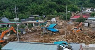 لقي شخصان حتفهما واعتبر خمسةآخرون في عداد المفقودين في مدينة جابيونغ في كوريا الجنوبية اليوم الأحد جراء انهيار أرضي وسيول جرفت سيارات وسط موجة من الأمطار الغزيرة. وبهذا يرتفع عدد القتلى على مستوى البلاد إلى 17، إضافة إلى فقد 11 منذ بدء هطول الأمطار يوم الأربعاء، وهو ما دفع أكثر من 13 ألفا على إخلاء منازلهم. وضرب انهيار أرضي موقع …